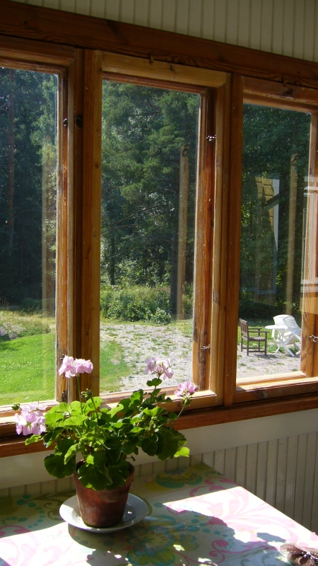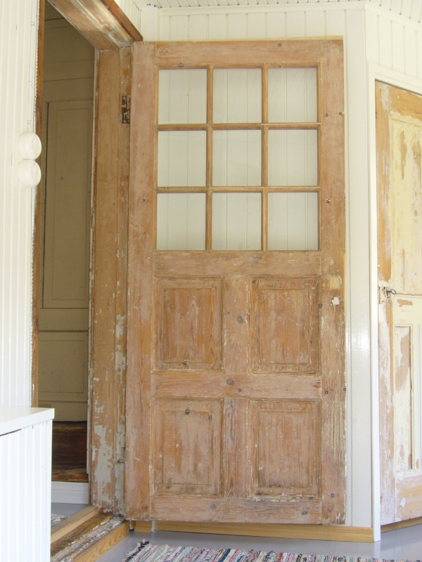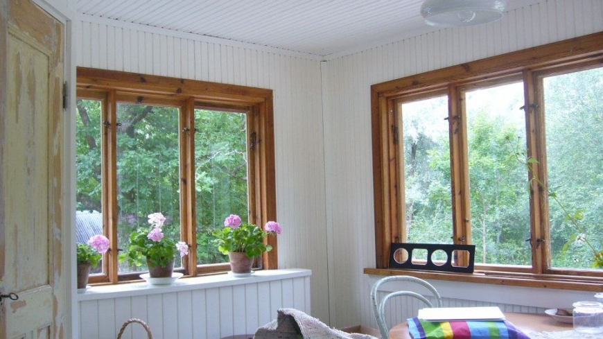 Kuistin sisäikkunat on tehty vanhoista pokista ja käsitelty pellavaöljyllä ja pigmentillä.